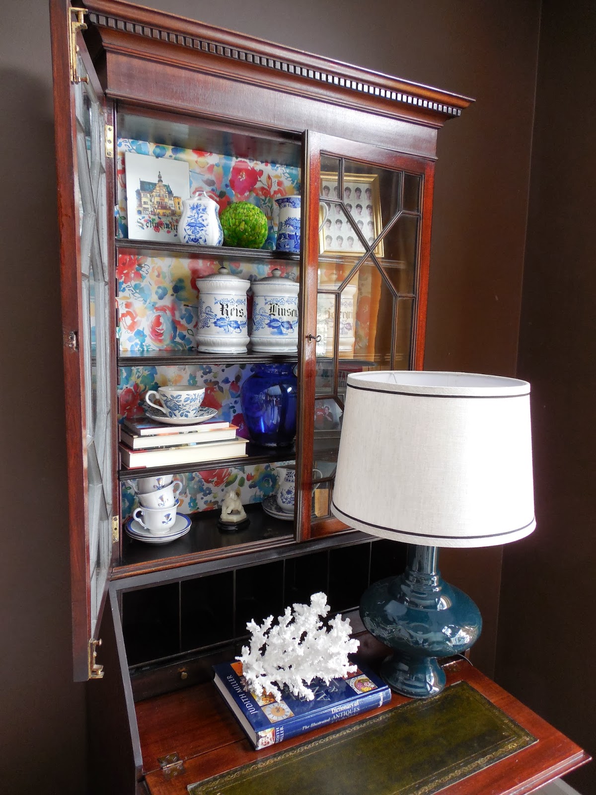 In my own home, I gave an antique secretary desk a new pattern by adding floral wrapping paper to the back of the shelves.